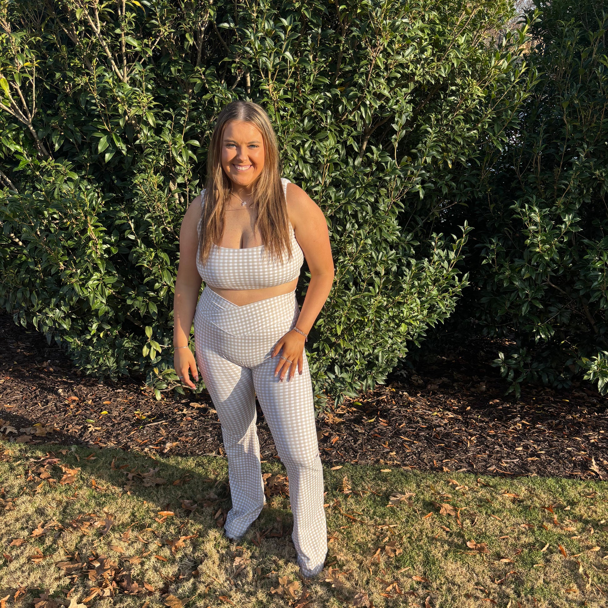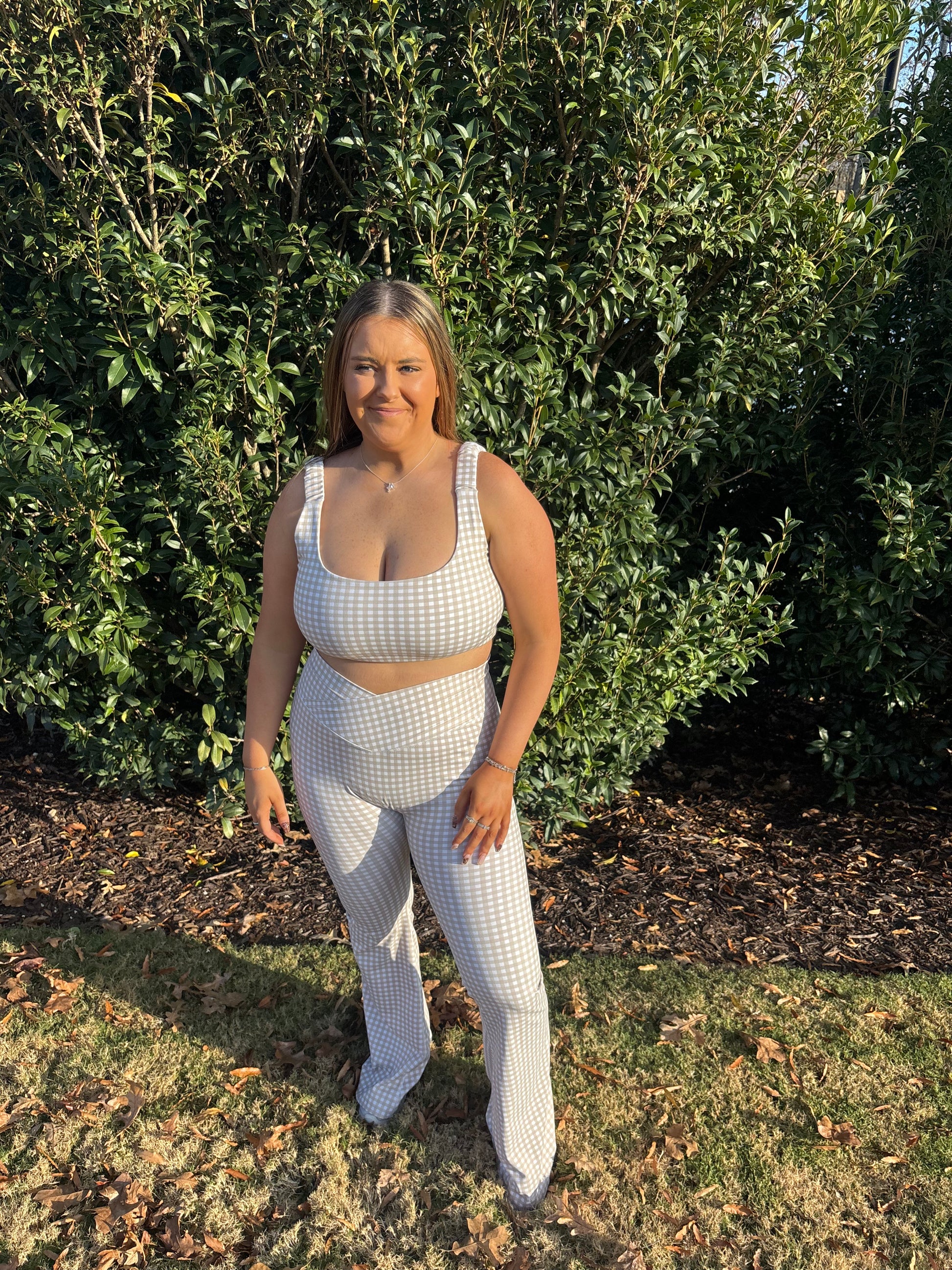 These flare leggings feature a charming brown gingham pattern and a flattering, modern silhouette. The waistband crosses in a stylish crisscross design at the front, adding a sculpted, waist-accentuating detail. Made from smooth, stretchy athletic fabric, the leggings hug comfortably through the hips and thighs before flaring out at the bottom for a sleek, elongated look. Both functional and fashion-forward, they bring a playful gingham twist to classic flare leggings.