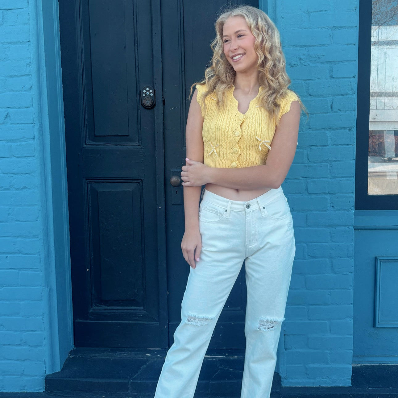 The good graces top has a playful and whimsical vibe with a lot of charming details. The cropped length gives it a trendy, youthful feel, making it perfect for layering over a cute blouse or pairing with high-waisted jeans or skirts. The vest features big buttons down the front, which add a bold, vintage-inspired touch and draw attention to the center.