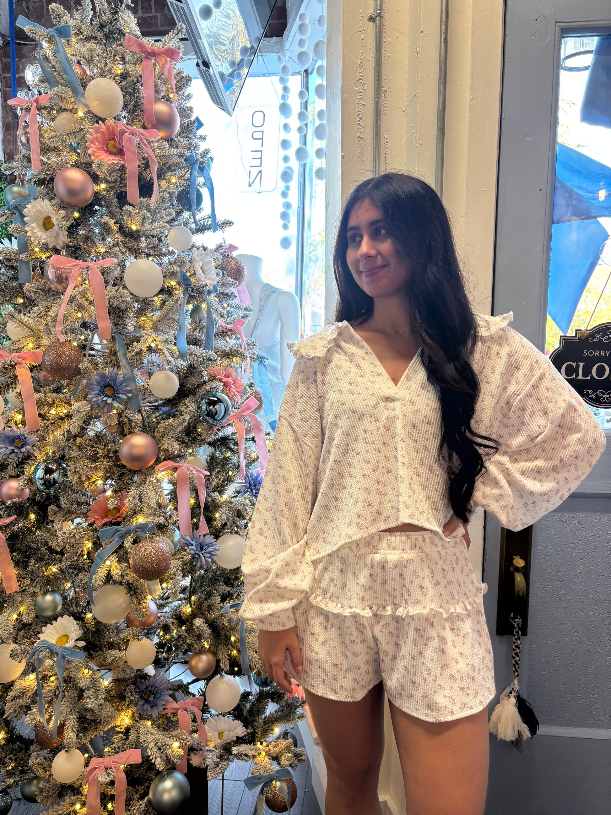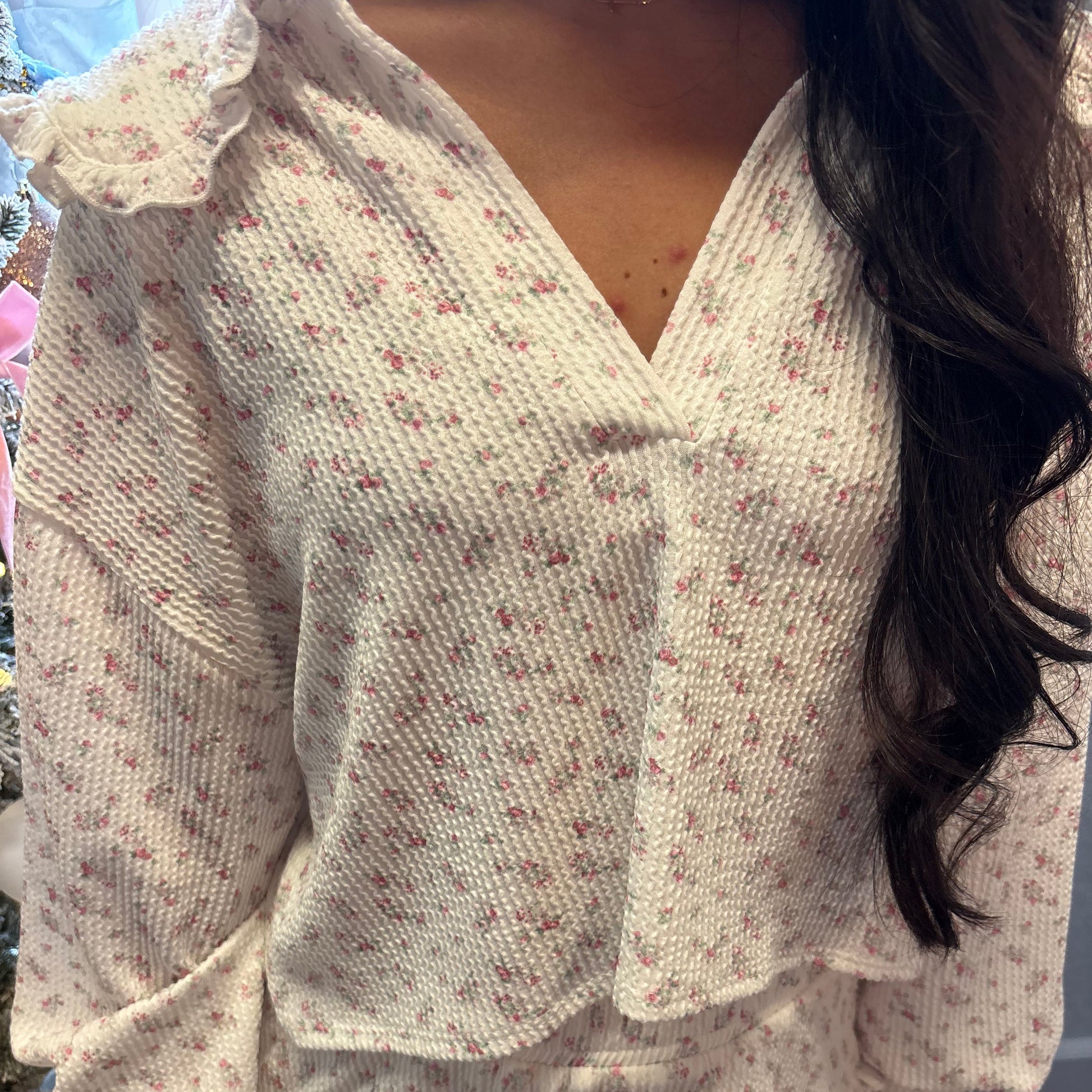 This set has small flower detailing all throughout the top and bottoms. It also has a ribbed texture which adds some depth to the piece. The top fits a bit loose for a more comfortable flattering fit. The collar has a bit of a ruffle detailing around the edge to add a more girly feel. Overall a perfect look for day to day wear!