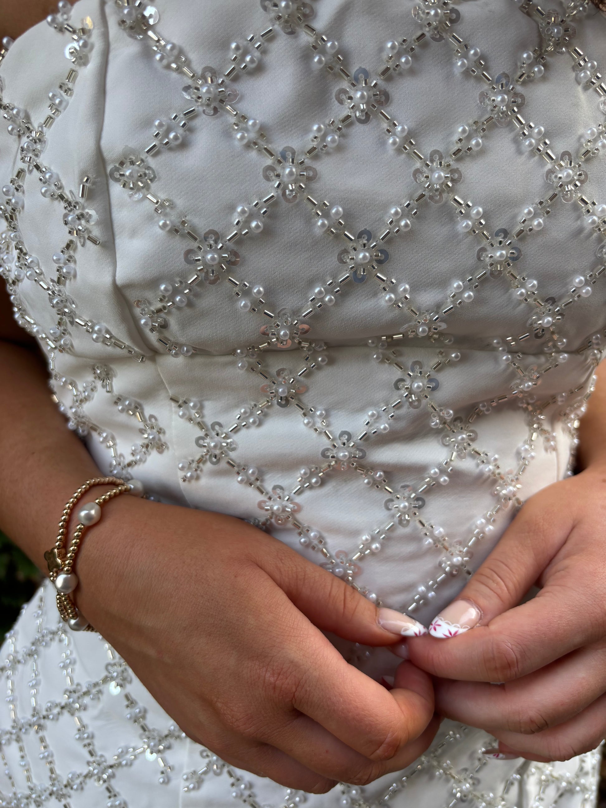 The dress is a strapless and structured with subtle boning that gently flares the sides to create a sculpted, hourglass silhouette. Its surface is completely adorned with an intricate, checkered-like pattern crafted from pearls, sequins, and long beaded embellishments. The pearls form soft, rounded points of light, while the sequins add a delicate shimmer and the elongated beads bring texture and dimension.