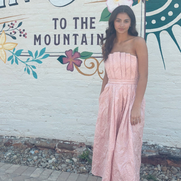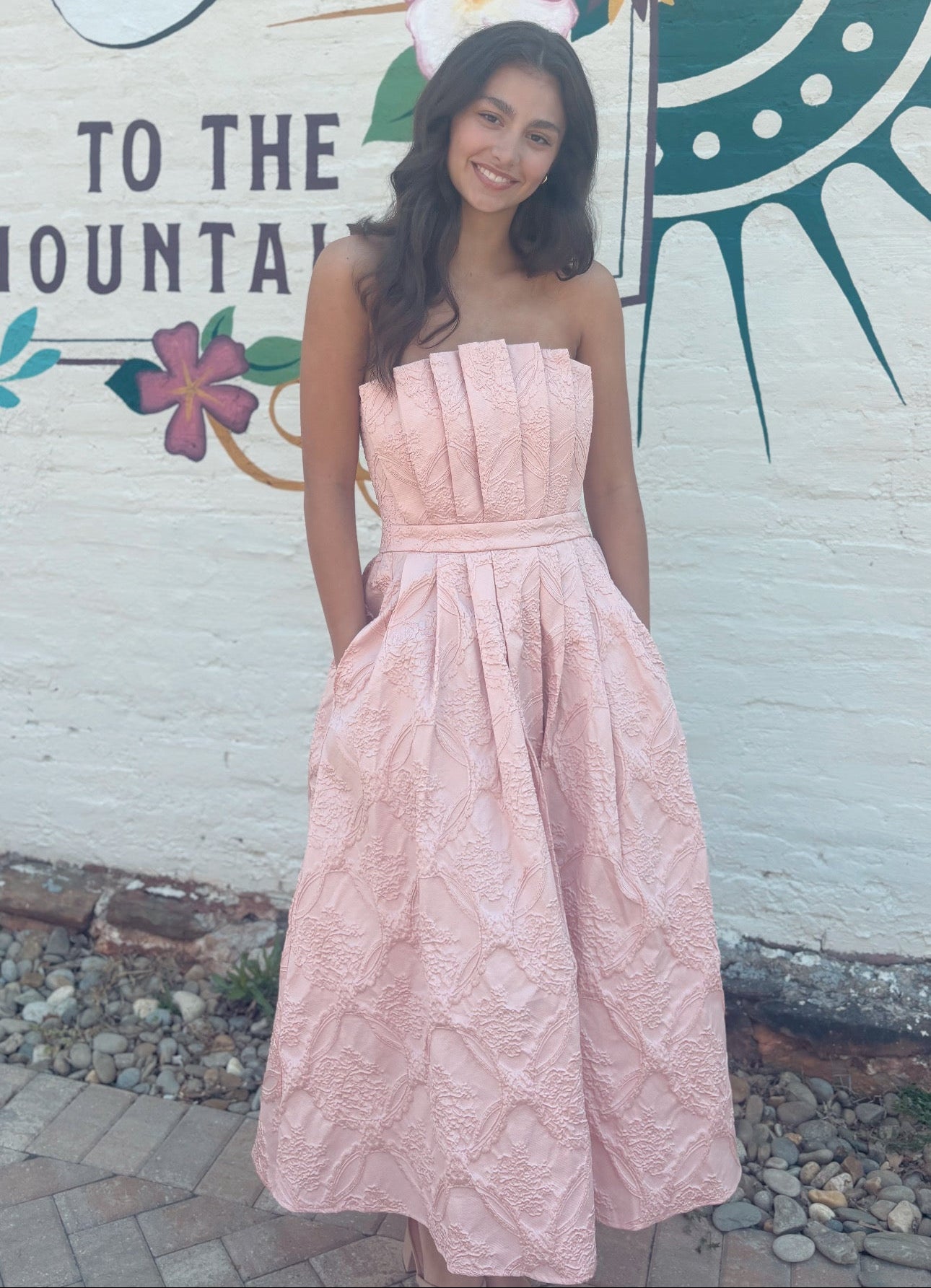 The dress is a soft, elegant shade of pink that radiates femininity and charm. It falls just below the knee, offering a graceful yet playful silhouette that moves gently with each step. The strapless bodice features finely crafted pleats that wrap around the top, adding dimension and structure while highlighting the neckline and shoulders. Below the pleated top, the skirt transitions into a beautifully textured flower design—raised, intricate floral patterns that give the fabric a tactile, romantic quality. The overall look is delicate yet striking, perfect for a summer wedding, garden party, or special occasion.