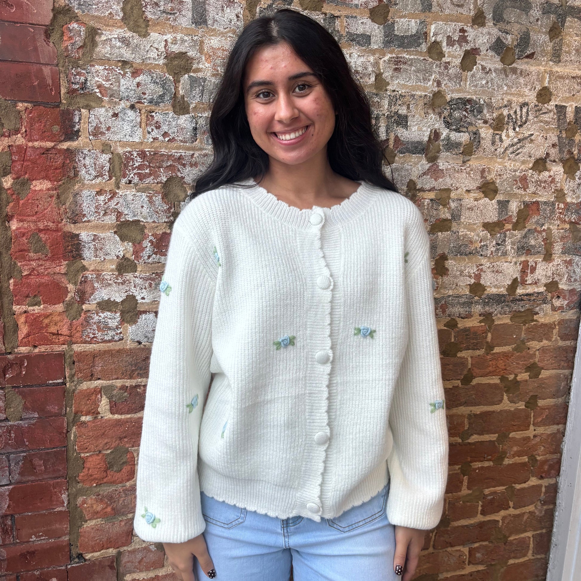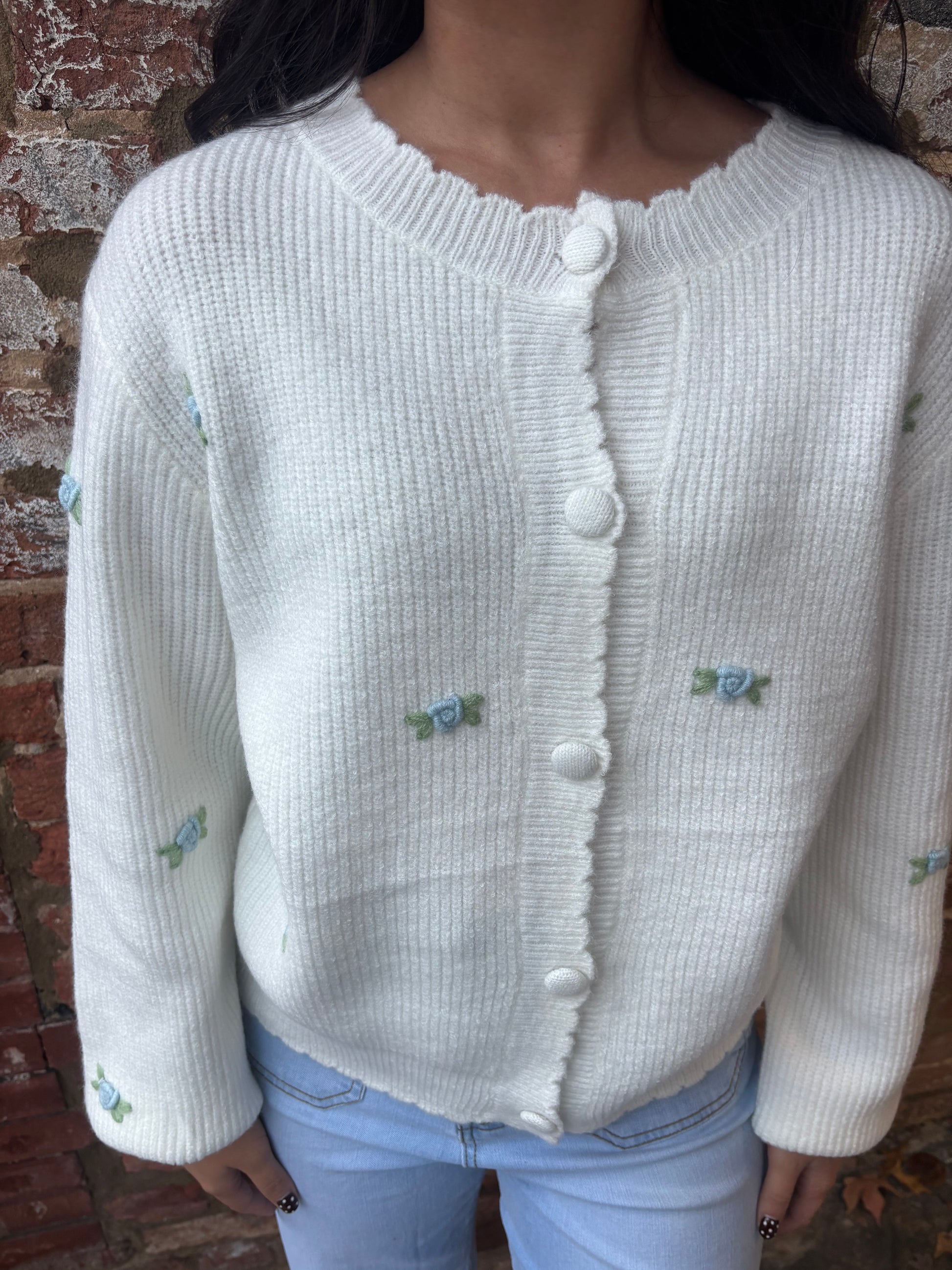 Layer this charming cardigan over dresses, skirts, shorts, or your favorite tee for effortless style. Delicate blue floral embroidery adds a whimsical touch that brings joy to any outfit. The Sweet Magnolia cardigan is your go-to piece for mixing and matching through every season—versatile, cheerful, and endlessly wearable.